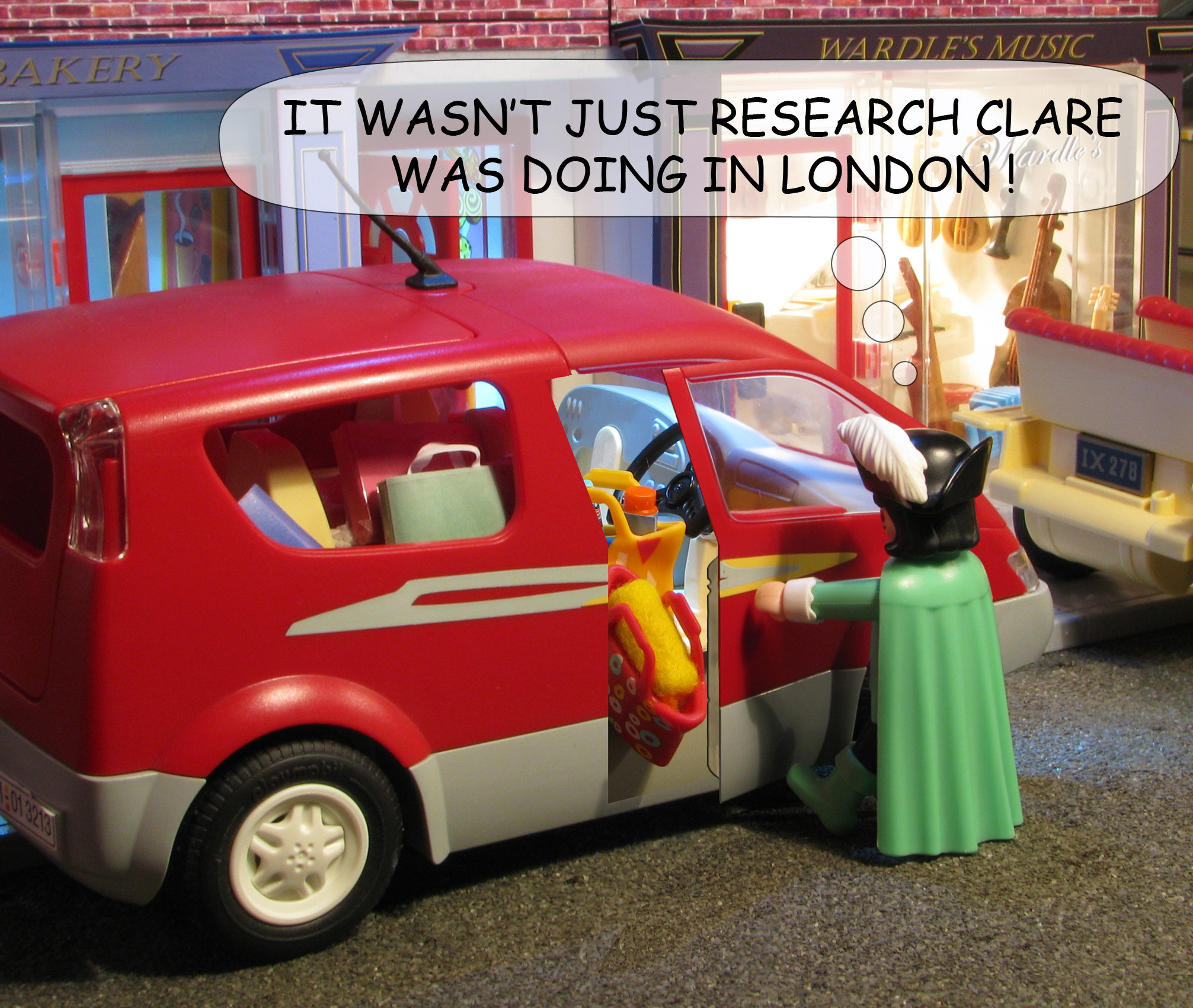 Opening a Playmobil car door - Unfortunately only the bonnets and boots of Playmobil cars open, so when I wanted a picture of Thomas opening a car door and Clare's shopping tumbling out, I hade to resort to some photo editing. Click on the picture below to see how it was done !